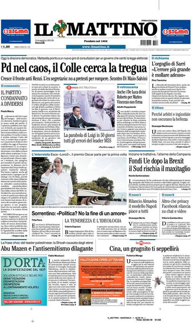 IL MATTINO – Ci sono diverse notizie di politica, cronaca e cultura italiana ed estera. Si parla però anche del Napoli e di Sarri che tiene vive le motivazioni dei suoi giocatori. E poi, perché torti arbitrali ed altre ingiustizie alla fine non riusciranno ad oscurare quanto di bello fatto dai calciatori azzurri.