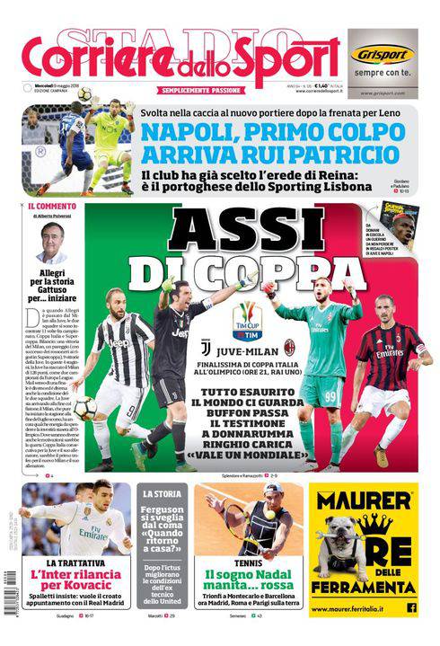 CORRIERE DELLO SPORT – Il giornale romano dò ampio risalto a Juventus-Milan, finale di Coppa Italia di stasera. Si parla però anche del Napoli e del probabili primo colpo di mercato messo a segno dal club di Aurelio De Laurentiis. Per un Reina che va via ecco Rui Patricio in entrata. Si tratta del titolare dello Sporting Lisbona e della nazionale portoghese, 30 anni. In basso, cavallo di ritono Kovacic per l’Inter. Sir Alex Ferguson si risvglia dal coma. Chiude la prima pagina il tennis.