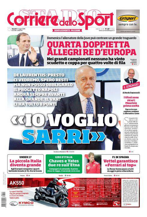 CORRIERE DELLO SPORT – Il quotidiano romano, nella sua edizione campana, porta in prima pagina le dichiarazioni rilasciate ieri in prima persona da Aurelio De Laurentiis. Il presidente del Napoli si augura che Sarri rimanga sulla panchina azzurra e parla di un incontro che è in agenda per la prossima settimana. “Ma il nostro progetto proseguirà a prescindere dalla sua scelta. Con la Var abbiamo perso 8 punti decisivi per lo scudetto”. I tifosi azzurri vorrebbero una rinconferma. In alto, Allegri primo allenatore in assoluto a vincere due trofei nazionali per 4 volte consecutive. Chiudono la prima pagina altre notizie di calcio e vari sport.