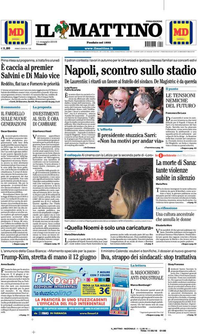 IL MATTINO – Il quotidiano di Napoli parla di tante notizie di politica e cronaca sia italiane che estere. Ma campeggia la questione stadio in prima pagina, con un duro botta e risposta tra De Laurentiis e De Magistris. Per il presidente azzurro, il sindaco di Napoli starebbe ritardando i lavori all’impianto di Fuorigrotta per favorire suo fratello. Il primo cittadino risponde a tono.