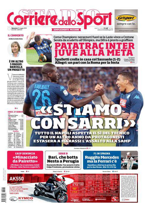 CORRIERE DELLO SPORT – L’edizione campana del quotidiano sportivo romano mette i calciatori del Napoli nella sua prima pagina. “Stiamo con Sarri”. La squadra è tutta a favore della permanenza dell’allenatore sulla panchina azzurra. L’anno prossimo ci saranno basi anche più solide per tentare l’assalto allo scudetto. In alto “Patatrac Inter”. I nerazzurri perdono ancora in casa dopo l’incredibile sconfitta subita due settimane fa con la Juventus. Stavolta è il Sassuolo ad ammutolire San Siro e a far si che la banda di Spalletti in pratica non acceda alla prossima edizione della Champions League. Se oggi la Lazio vince a Crotone i giochi saranno fatti. Chiudono altre notizie di calcio e vari sport.