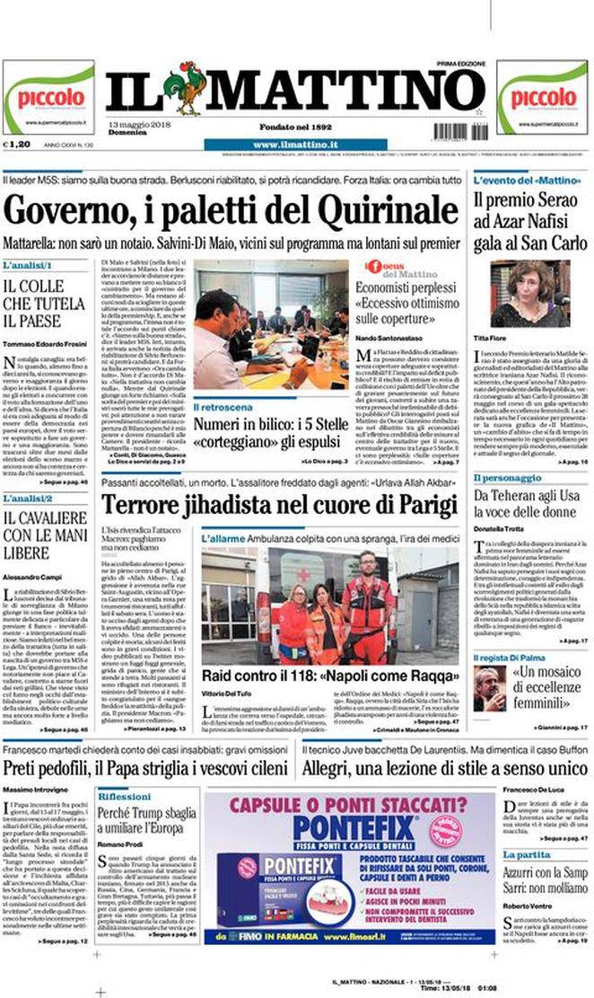 IL MATTINO – Il giornale di Napoli pone in risalto diverse notizie di cronaca e politica sia estera che italiana. Si parla però anche del Napoli: “Azzurri con la Samp, Sarri: “Non molliamo”. E non manca una critica ad Allegri, che aveva commentato a modo suo le parole di De Laurentiis di qualche giorno fa. ‘Dimenticando’ però del tutto quanto detto da Buffon dopo Real Madrid-Juve.