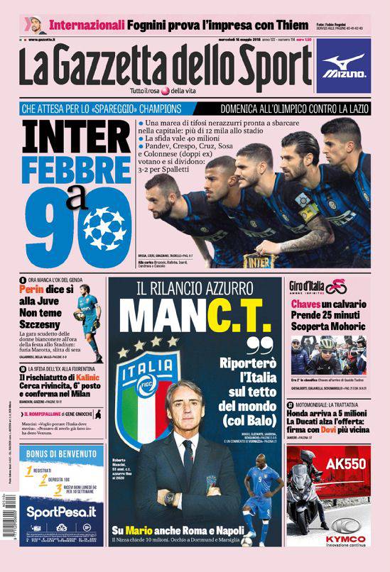 GAZZETTA DELLO SPORT – Idea Gundogan per l’Inter, ma solo se i nerazzurri riusciranno a battere la Lazio ed a centrare il quarto posto che vale l’accesso alla prossima edizione della champions League. È quanto riporta il giornale milanese nella sua prima pagina, occupata poi da altre news principalmente di calcio. Parla Mancini, che nella sua Italia è intenzionato a richiamare Balotelli. Poi c’è il genoano Perin che sembra abbia scelto la Juventus, nonostante la presenza del titolare designato Szczesny. In basso si parla di Milan, a destra Giro d’Italia e motociclismo.