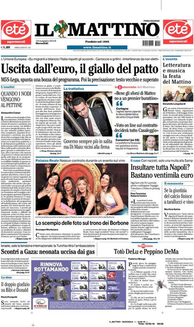 IL MATTINO – Il quotidiano napoletano presenta svariati aggiornamenti di politica e di cronaca, sia italiana che estera. Si parla del Napoli in un articolo fortemente critico sulla giustizia calcistica, che punisce i beceri cori mandati in atto dai tifosi della Sampdoria nella partita di domenica scorsa con una semplice ammenda. “Insultare tutta Napoli? Bastano ventimila euro”.