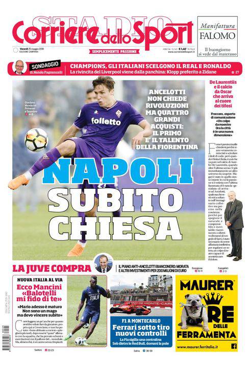 CORRIERE DELLO SPORT – L’edizione campana del quotidiano romano presenta in prima pagina l’idea Federico Chiesa. Il Napoli segue il giovane talento della Fiorentina da oltre un anno. E l’approdo di Carlo Ancelotti sulla panchina azzurra potrebbe rappresentare un ulteriore motivo di attrazione per il talento dei toscani. Il CorSport scrive: “Ancelotti non chiede rivoluzioni ma quattro grandi acquisti”. Il primo sarebbe proprio Chiesa Jr, per poter potenziare la già importantissima base costituita dall’organico gestito negli ultimi tre anni da Maurizio Sarri. A destra, elogio a De Laurentiis. In alto, Real Madrid favorito per la vittoria in Champions domani col Liverpool. In basso, “La Juve compra”, e si parla di Balotelli in Nazionale. Chiusura con il GP di Monaco per la Formula 1.
