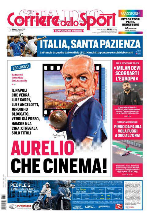 CORRIERE DELLO SPORT – Il quotidiano romano presenta in primo piano una intervista ad Aurelio De Laurentiis. Il presidente del Napoli parla del futuro del club azzurro, con la nuova gestione tecnica di Ancelotti. “Rifiutata la maxiofferta del Manchester City per Jorginho, abbiamo preso Verdi. Hamsik è libero di andare se vuole”. A destra, il Milan è sempre a rischio Europa. In alto si parla del ko in amichevole dell’Italia. Chiudono la prima pagina altre notizie di calcio e vari sport.