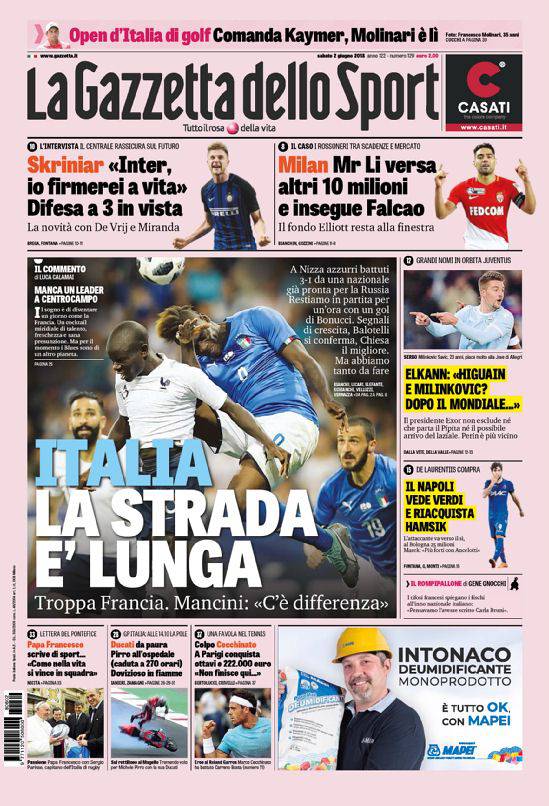 GAZZETTA DELLO SPORT – “Italia, la strada è lunga” titola il giornale milanese in riferimento al 3-1 dell’amichevole contro la Francia di ieri. La Nazionale di Roberto Mancini ad ogni modo non sfigura, ma ci sono dei limiti da dover arginare e migliorare. In alto, Skriniar giura fedeltà all’Inter. Ed i guai finanziari del Milan vengono tamponati da Mister Li. Ora si insegue Radamel Falcao del Monaco. Parla John Elkann: “Per Higuain e Milinkovic-Savic alla Juventus vediamo dopo il Mondiale”. Il Napoli trova Verdi e ritrova Hamsik. Chiudono la prima pagina notizie varie di altri sport.