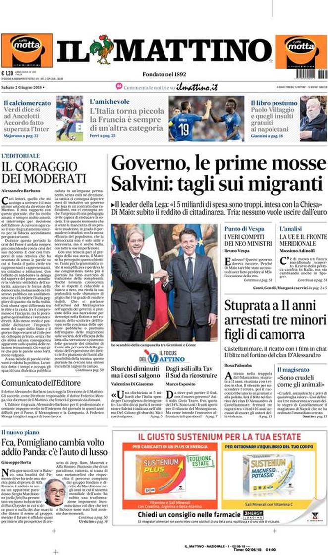 IL MATTINO – Il giornale napoletano parla delle trattative del Napoli. Verdi si è convinto ad accettare l’azzurro ed a breve verrà ufficializzato. Battuta l’Inter. L’Italia perde in amichevole contro la Francia. Per il resto la prima pagina è composta da notizie di politica e cronaca italiane.
