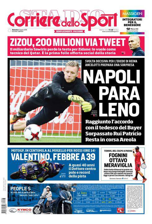 CORRIERE DELLO SPORT – L’edizione campana del quotidiano romano parla di una svolta tra i pali del Napoli. Per gli azzurri torna prepotentemente alla ribalta il nome di Bernd Leno. Il tedesco del Bayer Leverkusen sarebbe più vicino, con già un accordo trovato con il suo entourage e la società di Aurelio De Laurentiis. L’altra scelta è rappresentata da Alphonse Areola, che Ancelotti ha già allenato al Paris Saint-Germain in passato. Ormai non è più da considerare la pista che porta a Rui Patricio. In alto, il Qatar è pronto a ricoprire d’oro Zinedine Zidane: pronti 200 milioni di euro per 4 anni. Sono 50 a stagione se Zizou accetterà di fare da commissario tecnico della nazionale. Chiudono la prima pagina il Motociclismo (oggi il GP d’Italia al Mugello) ed il Roland Garros.