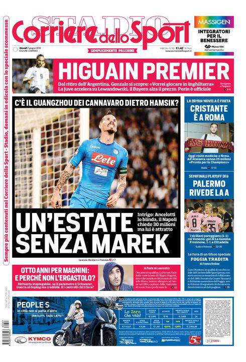 CORRIERE DELLO SPORT – L’edizione campana del quotidiano romano apre con Marek Hamsik in primo piano. Il Guangzhou di Fabio e Paolo Cannavaro tenta il capitano del Napoli. La telefonata di Ancelotti dei giorni scorsi era stato un segnale importante, ma lo slovacco sembra essere ancora indeciso. Per lui De Laurentiis chiede 30 milioni di euro, Hamsik in Cina ne guadagnerebbe circa 10 a stagione. In alto, Higuain può lasciare la Juventus. L’argentino, dal ritiro della sua nazionale, ha fatto sapere di voler provare una esperienza inglese. I bianconeri sono a caccia di un sostituto ed intanto si assicurano Mattia Perin dal Genoa. Acquisto anche in casa Roma: arriva Bryan Cristante dall’Atalanta. Chiudono la prima pagina del CorSport i playoff di Serie B (doppio 1-1 in Venezia-Palermo e Cittadella-Frosinone) ed i guai per doping dell’ex nuotatore, Filippo Magnini.