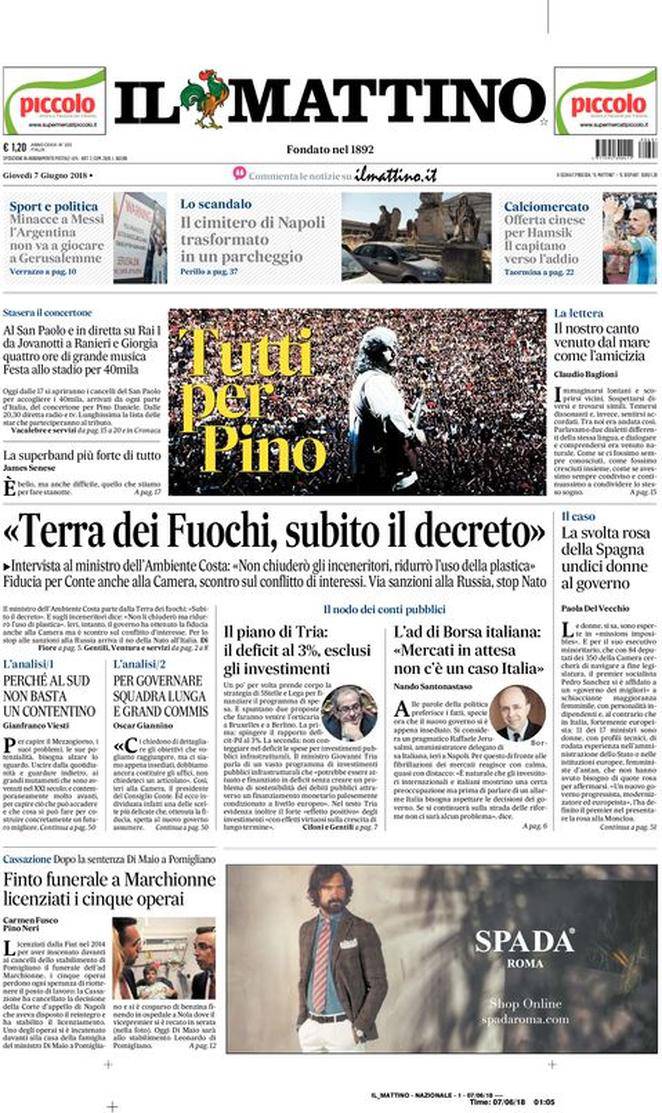 IL MATTINO – Il giornale napoletano riporta diverse notizie e vari aggiornamenti su politica e cronaca italiana ed anche estera. Si parla pure di calcio, con la Cina che stuzzica Hamsik e le minacce a Messi che sono valse la non disputa di Israele-Argentina a Gerusalemme.