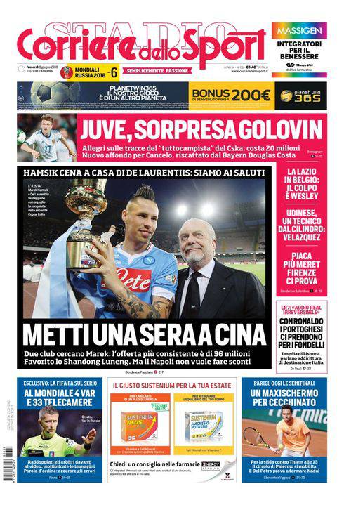 CORRIERE DELLO SPORT – Il quotidiano romano, nella sua edizione campana, parla del probabile addio di Marek Hamsik al Napoli. Lo slovacco, nonostante la telefonata di Carlo Ancelotti ricevuta nei giorni scorsi, si sarebbe convinto a provare la ricchissima avventura in Cina. Il capitano azzurro ha incontrato Aurelio De Laurentiis a cena per parlare della situazione. Il club non alzerà le barricate ma pretende almeno 30 milioni di euro dalla sua cessione, grossomodo quanto andrà a guadagnare lo stesso Hamsik. In alto, Juve sul giovane centrocampista russo Golovin. I bianconeri riscattano Douglas Costa dal Bayern Monaco e cercano Joao Cancelo, che l’Inter non riscatterà. Chiudono altre notizie di calcio e vari sport.