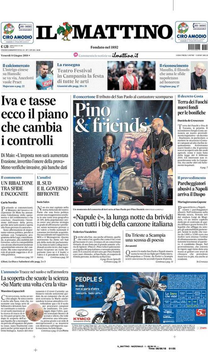 IL MATTINO – Il giornale napoletano presenta come sempre diverse notizie di cronaca, politica e cultura sia italiane che estere. Prima pagina dedicata al concerto ‘Pino & Friends’ dedicato al grande Pino Daniele e che si è svolto ieri sera allo stadio ‘San Paolo’. Si parla anche del Napoli, con Hamsik sul punto di dire addio agli azzurri. Al suo posto Ancelotti avrebbe indicato alla dirigenza Praet della Sampdoria.