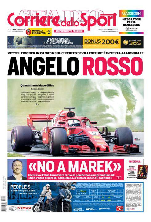 IL CORRIERE DELLO SPORT – La prima pagina del quotidiano romano, nella sua edizione campana, mette in primo piano la vittoria della Ferrari nel Gran Premio del Canada. Un successo molto significativo, colto nella patria dell’ex ferrarista Gilles Villeneuve, che pure vinse 40 anni fa. E Sebastian Vettel, che ieri è riuscito a piazzarsi davanti a tutti, si prende anche la vetta della classifica piloti. In basso si parla del Napoli e di Hamsik. “No a Marek”, afferma Fabio Cannavaro, allenatore del Guangzhou Evergrande. E che come vice ha anche il fratello Paolo. Il motivo è ‘affettivo’. Fabio Cannavaro rivela: “Non voglio essere io, napoletano, a portare via il capitano dal Napoli”.