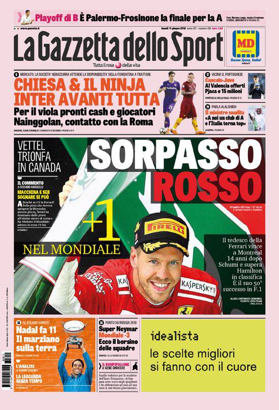 GAZZETTA DELLO SPORT – Anche la Rosea pone in risalto il successo di Sebastian Vettel e della Ferrari. Semplice ma esemplificativo il titolo: “Sorpasso Rosso”. In alto, shopping da favola per l’Inter che mette nel mirino Federico Chiesa e Radja Nainggolan. Affari possibili. La Juventus invece insegue Joao Cancelo ed offre al Valencia Pjaca e 15 milioni di euro. Chiudono la prima pagina altre notizie di calcio e vari sport, tra i quali l’undicesimo trionfo di Rafa Nadal al Roland Garros.