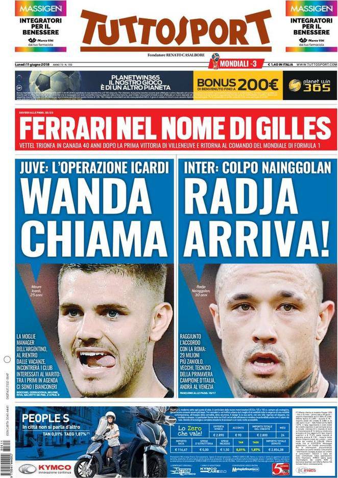 TUTTOSPORT – Il giornale di Torino pone in primo piano le vicende di mercato di Juventus ed Inter. I bianconeri tentano, e non poco, Mauro Icardi, ed approcciano la moglie e manager, Wanda Icardi. I nerazzurri d’altro canto ci provano per Nainggolan. Ed è presumibile che i soldi possano arrivare vendendo proprio Maurito. In alto, grande Sebastian Vettel e grande Ferrari nel GP del Canada, “Nel nome di Gilles”.