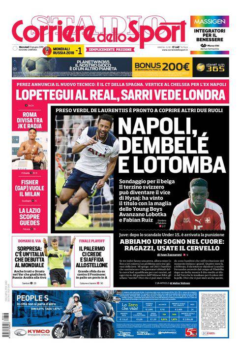 CORRIERE DELLO SPORT – Il quotidiano romano, nella sua edizione campana, parla del Napoli. Gli azzurri sono presenti su Dembelé del Tottenham oltre che sul giovane svizzero Lotomba dello Young Boys. Quest’ultimo può essere il perfetto vice-Hysaj. Si cercano anche Fabian Ruiz del Betis e Lobotka del Celta Vigo, entrambi centrocampisti. In alto, Sarri incontra il Chelsea, al Real Madrid andrà in qualità di allenatore per i prossimi 3 anni Lopetegui, attuale commissario tecnico della Spagna. Mercato: la Roma prende Justin Kluivert e mette in vendita Nainggolan, sul quale c’è l’Inter. Il danese Fisher spinge per andare il Milan. Chiudono la prima pagina altre notizie di calcio, tra le quali un pò d’Italia ai Mondiali con Irrati quarto uomo in Russia-Arabia Saudita, match di apertura della Coppa del Mondo domani alle 17:00. E poi c’è Palermo-Frosinone per la finale dei playoff di Serie B.