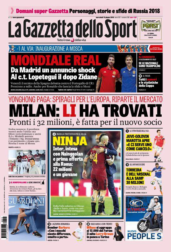 GAZZETTA DELLO SPORT – Il quotidiano in rosa parla del Milan, che sembra aver risolto i propri grossi guai finanziari. I soldi adesso ci sono ed il mercato può cominciare. L’Inter trova un accordo con Radja Nainggolan, ora si tratta con la Roma. I nerazzurri offrono 22 milioni di euro ed un giovane. A lato: Marotta affonda per Golovin e per Joao Cancelo, entrambi sono da Juventus. La Sampdoria cede l’uruguaiano Torreina all’Arsenal, in cambio i blucerchiati otterranno 30 milioni di euro. In alto, -1 ai Mondiali che inizieranno domani con Russia-Arabia Saudita. E Lopetegui dopo la rassegna globale lascerà la panchina della Spagna per sostituire Zinedine Zidane al Real Madrid: il tecnico ha firmato un triennale coi Galacticos. Chiudono altre notizie di vari sport.