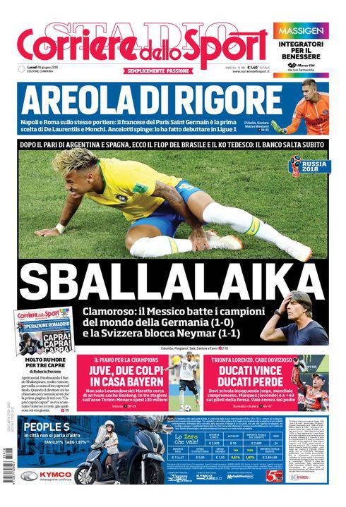 CORRIERE DELLO SPORT – Anche qui ci sono i passi falsi di Brasile e Germania. In alto, il Napoli non smette di seguire Alphonse Areola del Paris Saint-Germain. Sul 27enne portiere francese però fa irruzione adesso la Roma, alla ricerca di un sostituto per rimpiazzare il partente Alisson, che porterà nelle casse giallorosse una vagonata di soldi. Gli azzurri contano sul fattore Ancelotti: fu lui a farlo esordire in Ligue 1. In basso c’è l’asse Torino-Berlino per il calciomercato: Lewandowski è in orbita Juve, così come Jerome Boateng. E Marotta non molla Joao Cancelo. In basso chiudono la Serie B, con il terremoto post-Frosinone-Palermo, la finale dei playoff di Serie B che ha permesso ai ciociari di ritornare in Serie A, ed il motociclismo.