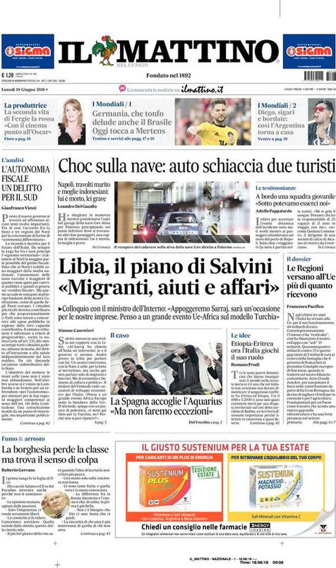 IL MATTINO – Il quotidiano napoletano parla di politica e cronaca italiane ed estere. Per quanto riguarda il calcio, oggi debutta i Mondiali il Belgio di Dries Mertens. E parla Maradona, scettico sulla sua Argentina.