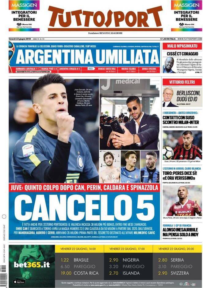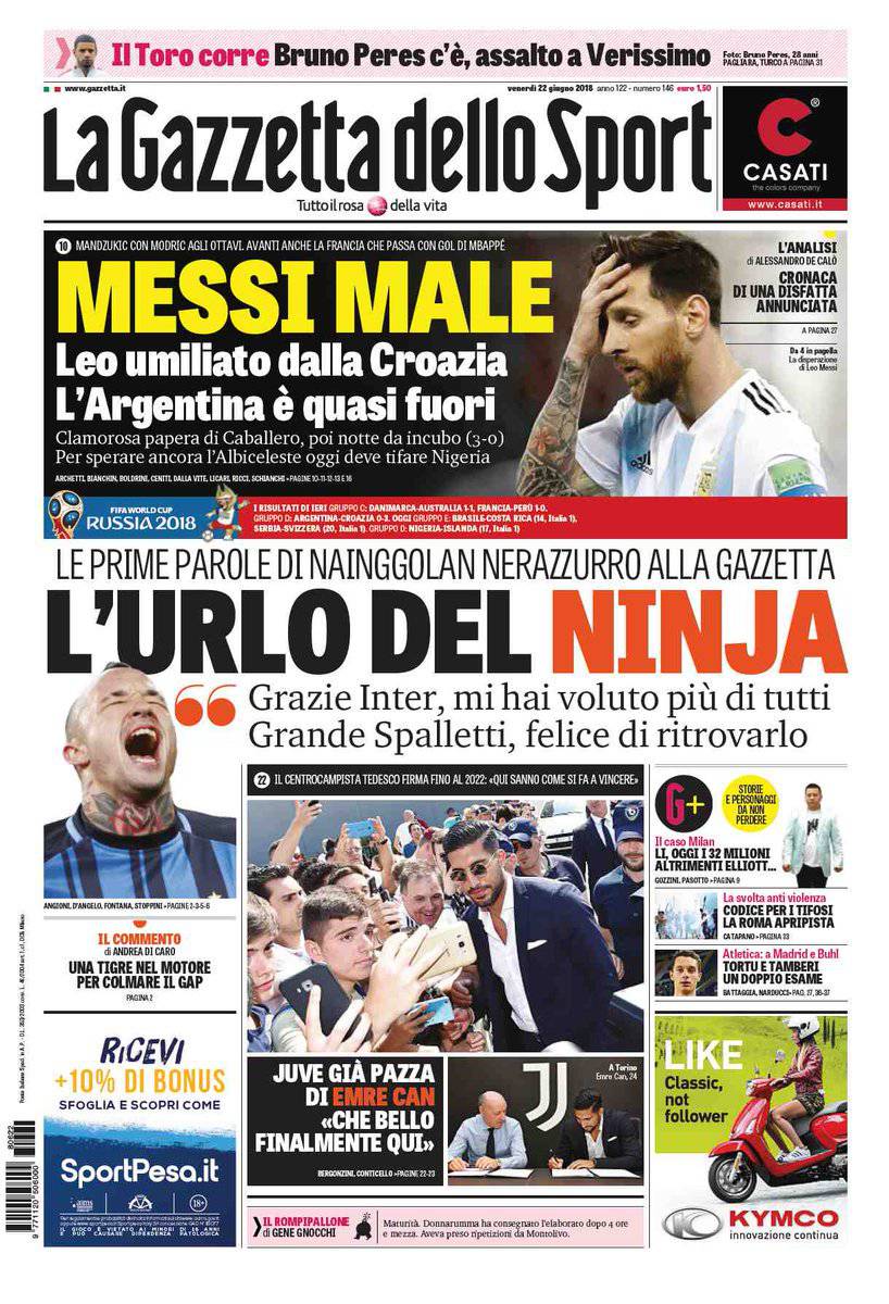 GAZZETTA DELLO SPORT – L’edizione odierna de “La Gazzetta dello Sport” si apre con l’annuncio del neo-acquisto Emre Can con i tifosi della Juventus già pazzi per l’ormai ex Liverpool. Nainggolan ha salutato i tifosi della Roma diventando di fatto un nuovo giocatore dell’Inter: “Grazie Inter, mi hai voluto più di tutti. Grande Spalletti, felice di ritrovarlo”. Nelle prossime ore potrebbe arrivare così già l’annuncio ufficiale. Infine, si parla anche del Mondiale con l’Argentina sconfitta 0-3 dalla Croazia: “Messi male. Leo umiliato dalla Croazia. L’Argentina è quasi fuori. Clamorosa papera di Caballero, poi notte da incubo. Per sperare ancora l’Albiceleste oggi deve tifare Nigeria”.