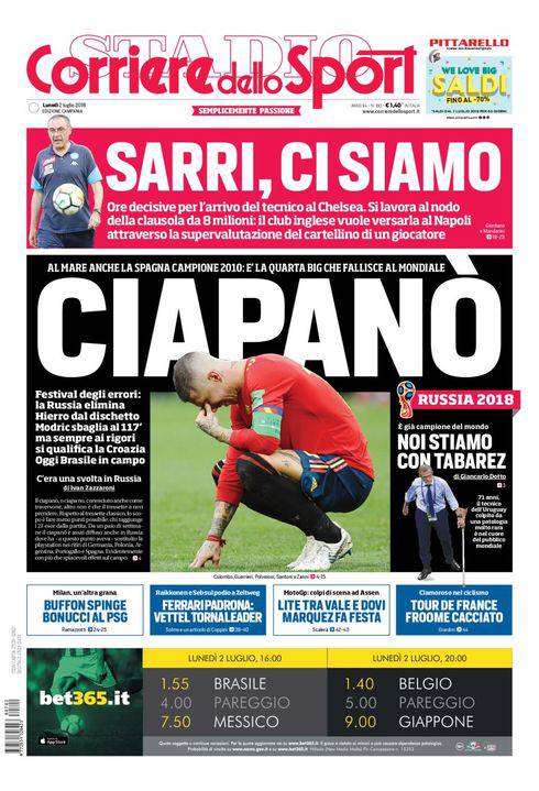 IL CORRIERE DELLO SPORT – La prima pagina del quotidiano romano nella sua edizione campana presenta in primo piano l’approdo sempre più vicino di Maurizio Sarri al Chelsea. L’ex allenatore del Napoli vede come unico scoglio le pretese economiche del club azzurro per liberarlo. Alla fine però il passaggio sulla panchina dei Blues da parte del tecnico toscano ci sarà. Al centro, continuano le sorprese ai Mondiali 2018. Esce infatti anche la Spagna, dopo la sconfitta ai calci di rigore contro i padroni di casa della Russia. In basso chiudono la prima pagina diverse notizie di calcio ed altri sport, in particolare Formula 1, MotoGP e ciclismo.