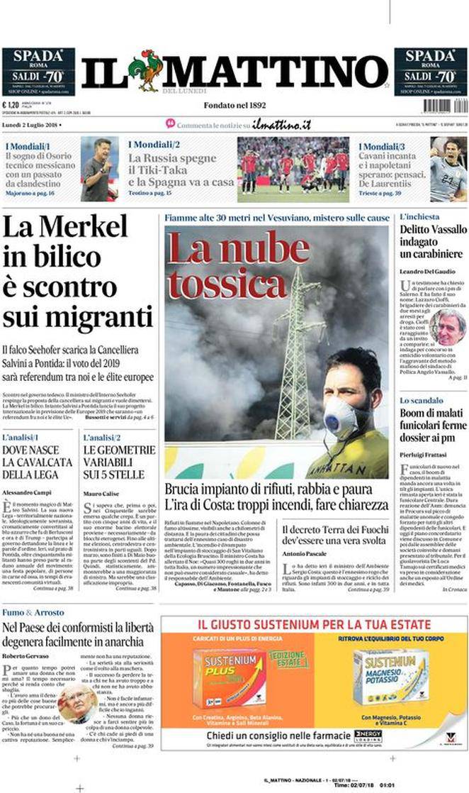 IL MATTINO – Il quotidiano napoletano presenta le solite news e gli aggiornamenti di politica e cronaca sia italiana che estera. Domina la prima pagina la nube tossica scatenatasi ieri nel Vesuviano. Per quanto riguarda il calcio si parla di Mondiali, tra il Messico che vuole sorprendere, la Spagna che torna a casa ed un Cavani che con i suoi due gol di due sere fa ha incantato tutti. Il Matador però è pessimista su un suo possibile recupero per i quarti di finale tra il suo Uruguay e la Francia.