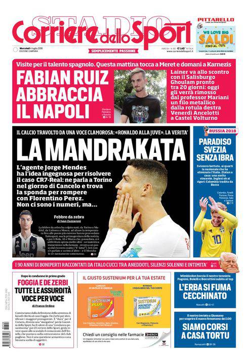 IL CORRIERE DELLO SPORT – L’apertura del quotidiano romano nella sua edizione campana presenta due colpi per Napoli e Juventus. Fabian Ruiz effettua le visite mediche per il club azzurro a Villa Stuart, ora manca solo la firma. Intanto Lainer va al muro contro muro con il Salisburgo: vuole andare in Campania, ma gli austriaci lo ritengono incedibile. Voce clamorosa per la Juventus: i bianconeri sarebbero su Cristiano Ronaldo. Mondiali: Svezia ai quarti di finale senza Ibrahimovic, avanza anche l’Inghilterra che sopravanza ai rigori la Colombia. Chiudono la prima pagina altre notizie di calcio ed altri sport.