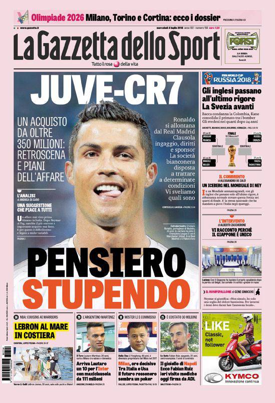 GAZZETTA DELLO SPORT – Anche sul giornale in rosa domina l’accostamento di Cristiano Ronaldo alla Juventus. Il tutto verrebbe a costare più di 350 milioni di euro, tra costo del cartellino ed ingaggio. A lato si parla dei Mondiali, con Svezia ed Inghilterra avanti. Ora si riprende venerdì con i quarti di finale. In basso altre notizie di calcio, tra le quali Fabian Ruiz che effettua le visite mediche a Villa Stuart. Chiudono la prima pagina altre news di sport.