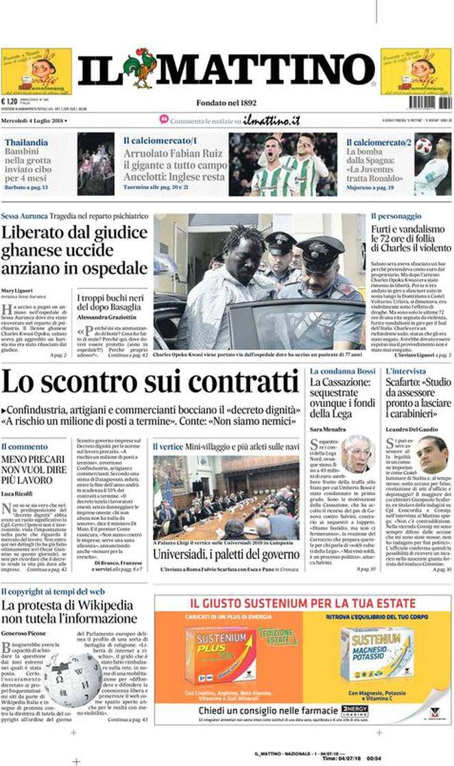 IL MATTINO – Il giornale napoletano presenta diverse notizie di politica e cronaca sia italiane che estere. Per quanto riguarda il calcio si parla di Fabian Ruiz e della possibilità che Roberto Inglese resti al Napoli.