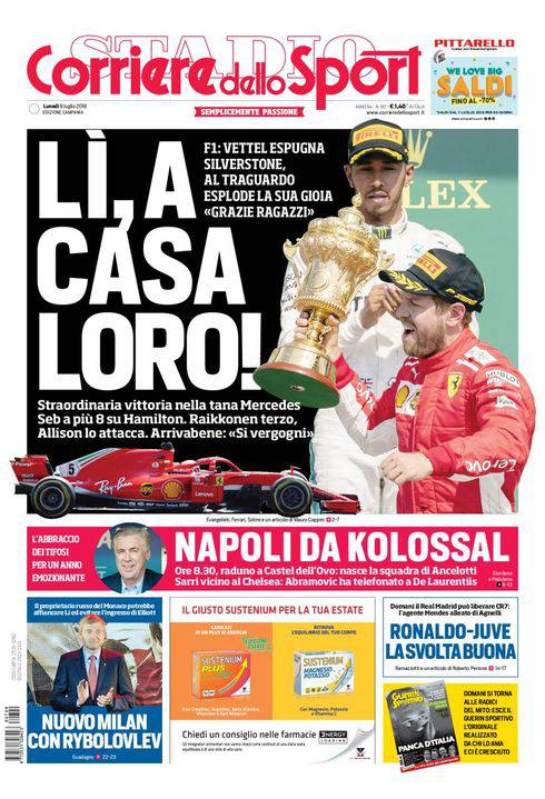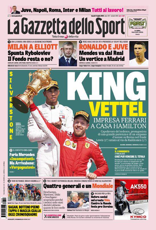 GAZZETTA DELLO SPORT – “King Vettel”, il ferrarista compie una vera e propria impresa vincendo in Inghilterra. In alto, Milan vicino all’ennesima svolta societaria. Cristiano Ronaldo alla Juventus, si muove l’agente Jorge Mendes in prima persona. In basso chiudono il Tour de France ed i Mondiali, che approdano alle semifinali con Francia-Belgio e Croazia-Inghilterra.