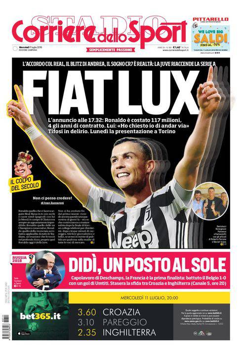 CORRIERE DELLO SPORT – Il giornale romano presenta Cristiano Ronaldo in prima pagina con la maglia della Juventus. È ufficiale il passaggio del 33enne attaccante portoghese ai bianconeri. Il costo totale è di 117 milioni di euro, con 4 anni di contratto. Lunedì prossimo la presentazione a Torino. In basso, la Francia è la prima finalista dei Mondiali. Gli uomini allenati da Didier Deschamps estromettono il Belgio di Dries Mertens. L’azzurro entra nella ripresa e mostra una buona vivacità, ma non riesce a dare una mano concreta ai suoi per segnare il gol del pareggio che avrebbe potuto condurre la gara ai supplementari.