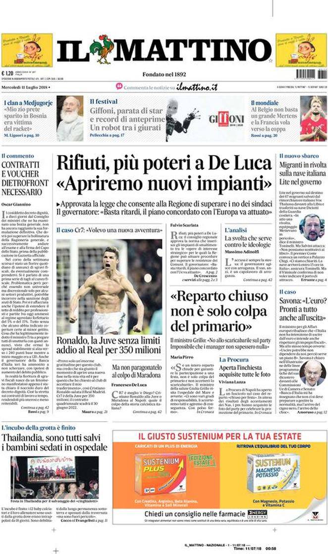 IL MATTINO – Il giornale di Napoli parla di notizie di cronaca e politica, sia italiane che estere. E per quanto riguarda il calcio ci si concentra sui Mondiali, con un buon Mertens che non riesce comunque ad evitare l’uscita in semifinale del Belgio per mano della Francia. Poi c’è Cristiano Ronaldo alla Juventus, un affare che ammonta ad almeno 350 milioni di euro tra costo del cartellino ed ingaggio fino al 2022.