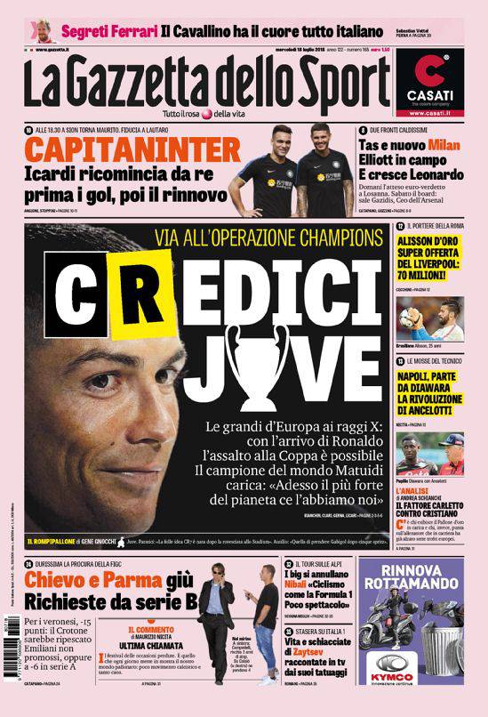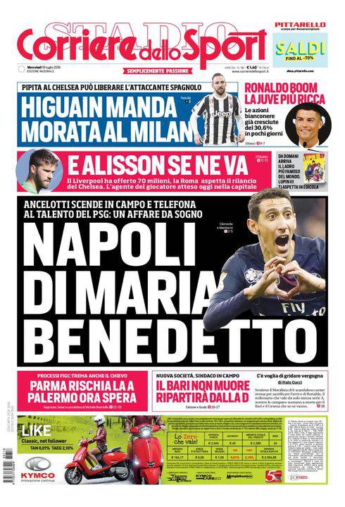 CORRIERE DELLO SPORT – La prima pagina dell’edizione campana del quotidiano fa un grande annuncio: Ancelotti avrebbe chiamato personalmente Di Maria per convincerlo a trasferirsi al Napoli. Ma si parla anche di Milan e Juventus, con questi ultimi che vedono le proprie azioni cresciute di oltre il 30% in pochi giorni grazie a Cristiano Ronaldo. I rossoneri invece potrebbero chiudere un grande colpo grazie a Sarri: Higuain al Chelsea, infatti, sbloccherebbe Morata al Milan.