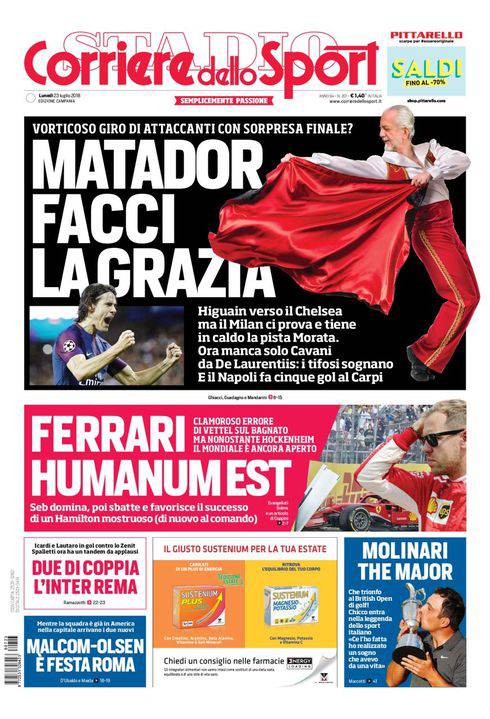 CORRIERE DELLO SPORT – L’edizione campana del quotidiano romano lavora di fantasia e titola: “Matador facci la grazia”, con tanto di Aurelio De Laurentiis in versione torero. Si preannuncia un giro di punte che potrebbe vedere tra i suoi protagonisti principali proprio Edinson Cavani, fortemente desiderato dai tifosi del Napoli. Poi si parla dell’harakiri Ferrari di ieri nel GP di Germania: grossolano errore di Vettel che costringe la sua Ferrari al ritiro, gode Hamilton che dal 14° posto iniziale finisce con l’aggiudicarsi la corsa. Poi è Molinari show in Scozia per quanto riguarda il golf. L’italiano rimonta tutti dalla 29/a posizione e vince. Chiudono la prima pagina altre notizie di calcio.