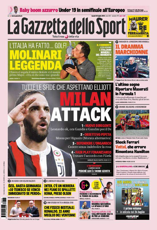 GAZZETTA DELLO SPORT – Qui in prima pagina c’è Gonzalo Higuain, in uscita dalla Juventus e che non è nemmeno stato convocato nella tournée americana dei bianconeri. In alto, c’è l’impresa di Molinari nel golf ma si parla anche della situazione drammatica di Sergio Marchionne, che versa ancora in gravi condizioni. Si parla in prima pagina anhe di Formula 1 e di altri sport, oltre che di calcio. Polemica Ozil, il tedesco lascia la nazionale per una controversa foto con il contestato leader turco Erdogan, chiude il quadro il calcio.