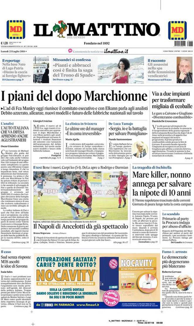 IL MATTINO – Il giornale napoletano parla di cronaca e di politica sia italiane che estere e sul Napoli parla di “spettacolo” dopo il 5-1 rifilato al Carpi ieri in amichevole.