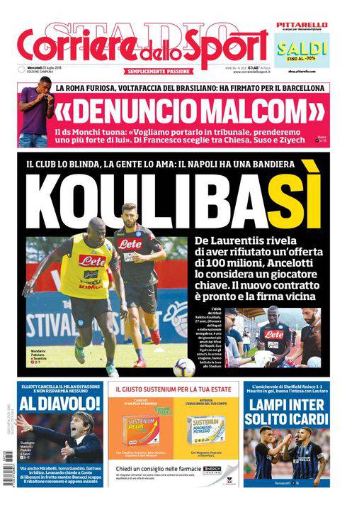 CORRIERE DELLO SPORT – L’edizione campana del quotidiano romano dedica la sua apertura principale a Kalidou Koulibaly. Il centrale senegalese è diventato un idolo per i tifosi ed un elemento centrale per il Napoli. Ormai è a tutti gli effetti una bandiera. E De Laurentiis conferma di aver detto di no ad una proposta di 100 milioni di euro per lui. Ancelotti lo ritiene un elemento chiave, così come era stato con Sarri. In alto, querelle velenosissima tra il brasiliano Malcom e la Roma. L’ex laterale del Bordeaux ha compiuto un vero e proprio voltafaccia ai giallorossi, scegliendo di andare al Barcellona, ma i giallorossi non ci stanno. In basso, contatto Conte-Milan, chiude la prima pagina l’Inter.