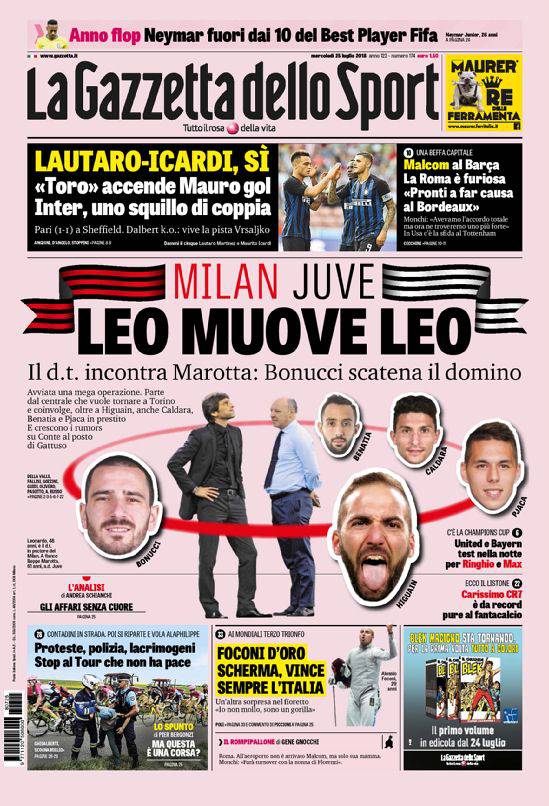 GAZZETTA DELLO SPORT – Il quotidiano in rosa parla delle vicende di calciomercato, che vedrebbero Juventus e Milan pronte ad uno scambio tra Higuain e Bonucci più soldi. Il ritorno in bianconero del difensore però non è visto affatto di buon occhio dal tifo organizzato juventino. Tra i campioni d’Italia possono partire anche Pjaca, Benatia ed il nuovo acquisto Caldara. In alto, funziona la coppia gol dell’Inter, Icardi-Lautaro Martinez. Roma furiosa con Malcom che ha scelto il Barcellona. In basso, Tour de France martoriato dalle proteste, chiude la prima pagina la scherma con il terzo successo in due giorni per l’Italia.