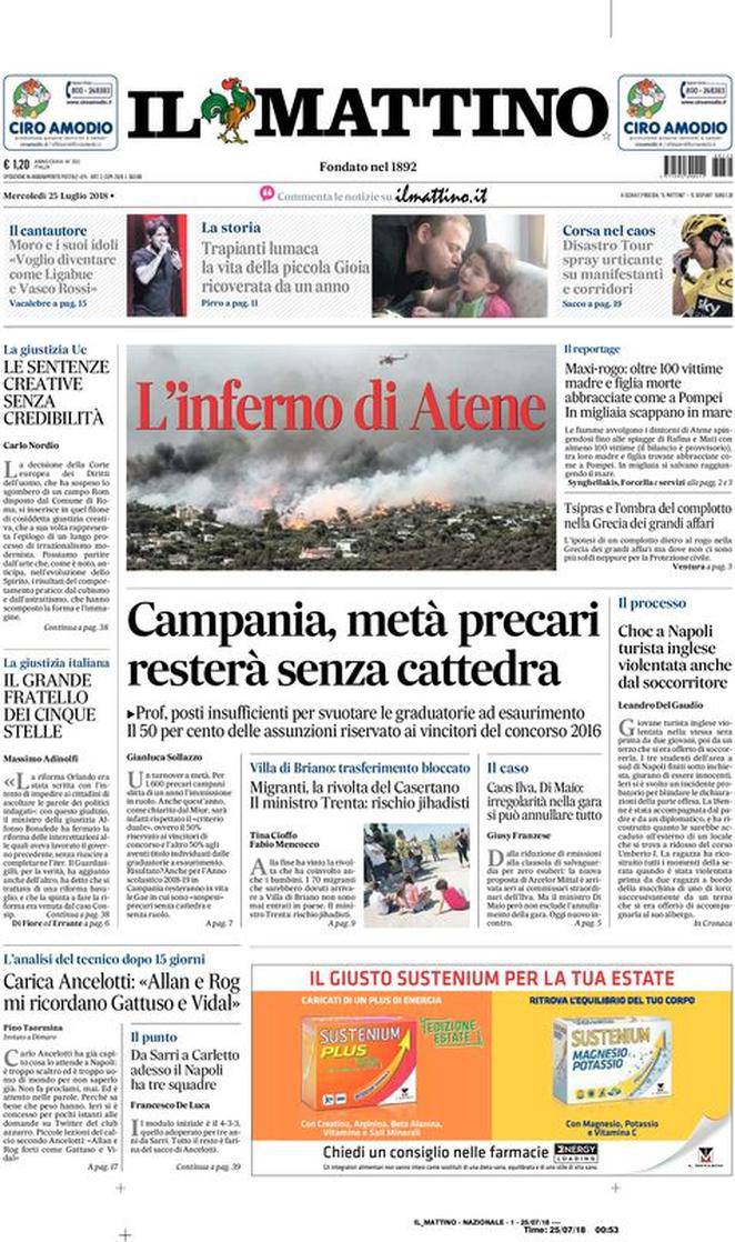 IL MATTINO – Il quotidiano napoletano presenta aggiornamenti di cronaca e politica sia italiane che estere. Per il calcio ecco le parole di Carlo Ancelotti. “Allan e Rog mi ricordano Gattuso e Vidal”.