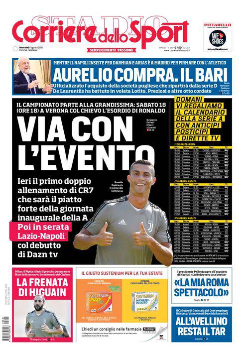 CORRIERE DELLO SPORT – L’edizione campana del quotidiano romano mette in risalto Aurelio De Laurentiis e Cristiano Ronaldo. Il presidente del Napoli acquista il Bari, che era fallito nelle scorse settimane e che ripartirà adesso dalla Serie D. ADL ha avuto la meglio tra gli altri su Lotito e Preziosi. Per quanto riguarda CR7, ieri c’è stato il primo doppio allenamento con la Juve, intanto è focus sui calendari, ci sarà lo scontro già alla settima giornata, a Torino. E Higuain verrà ceduto senza troppi complimenti. Per l’argentino c’è il Milan, anche se il Chelsea prova ancora ad inserirsi. In Serie B, l’Avellino sembra destinato al fallimento. Rimane solo il Tar agli irpini per salvare la categoria. Chiude una intervista a James Pallotta, presidente della Roma.