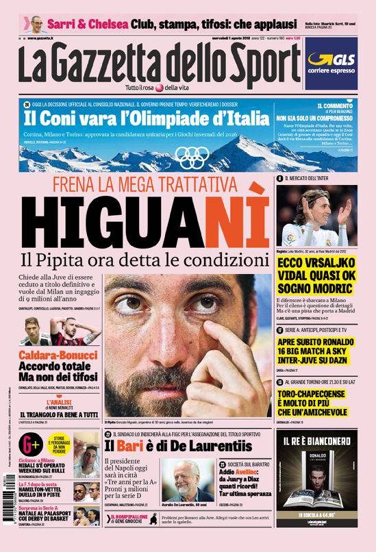 GAZZETTA DELLO SPORT – Sul giornale in rosa campeggia Higuain. Il passaggio al Milan sembrava praticamente certo fino a ieri. Ora però l’argentino chiede alla Juve la cessione solo a titolo definitivo, senza altre formule. E dal Milan pretende 9 milioni a stagione, quasi come a volere una buonuscita. In alto, il Coni pensa all’Olimpiade italiana. A lato, Inter scatenata: arriva Vrsaljko, ottime possibilità per Arturo Vidal e si pensa addirittura a Modric del Real Madrid. In basso, De Laurentiis prende ufficialmente il Bari. Chiudono la prima pagina varie news di calcio e di altri sport.