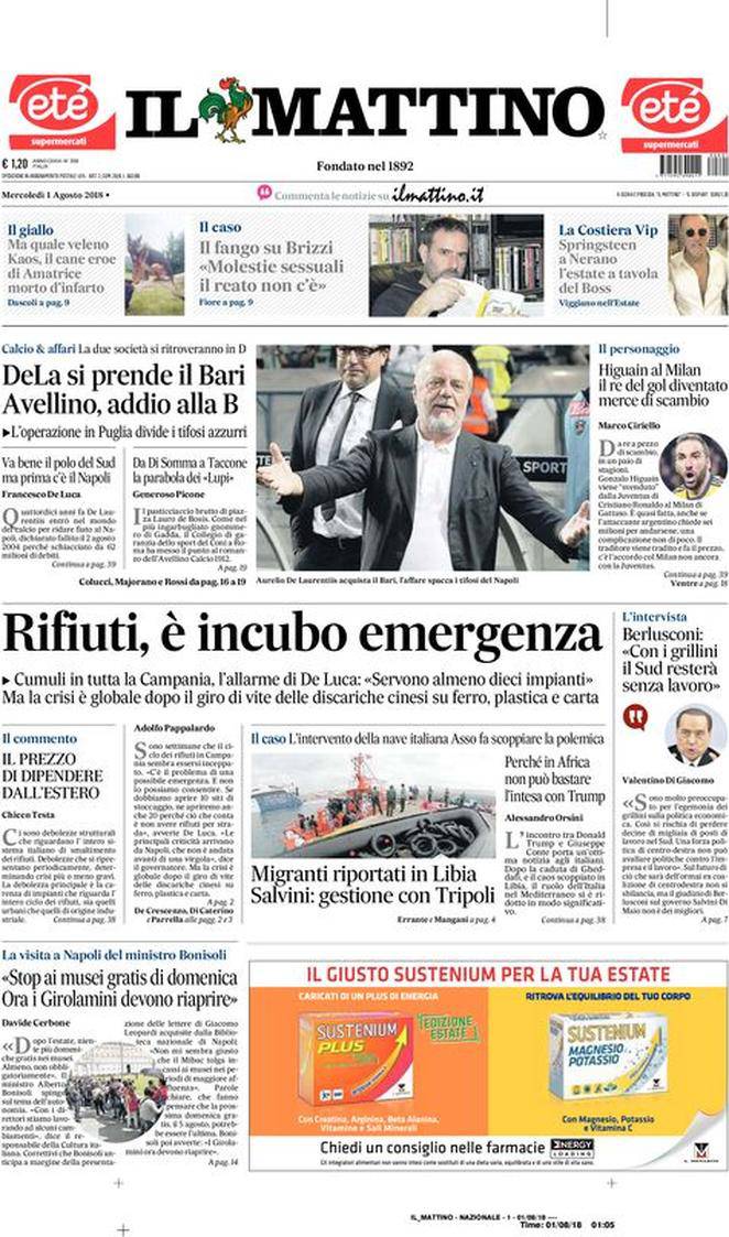 IL MATTINO – Anche il quotidiano di Napoli pone l’accento sull’acquisizione da parte di De Laurentiis del Bari. Mentre l’Avellino perde la Serie B. Per il resto completano la prima pagina altre notizie di cronaca, politica e cultura.