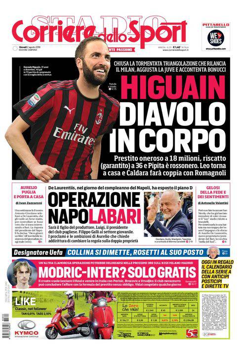 CORRIERE DELLO SPORT – La prima pagina dell’edizione campana del giornale romano mette in primo piano Gonzalo Higuain. L’ex attaccante del Napoli è in procinto di passare al Milan, nell’ambito di un maxiscambio che porterà in rossonero anche Mattia Caldara e farà si che Leonardo Bonucci ritorni in bianconero. Prestito con diritto di riscatto per Higuain, operazioni a titolo definitivo le altre due. Per quanto riguarda il Napoli, De Laurentiis rilancia il suo progetto sul Bari e sceglierà di porre a capo del club il figlio Luigi e di affidare il settore giovanile a Filippo Galli, fresco di divorzio dal Milan. In basso, Collina si dimette da capo degli arbitri UEFA, Rosetti al suo posto. E l’Inter crede nel sogno Modric. Chiudono la prima pagina altre notizie di calcio.