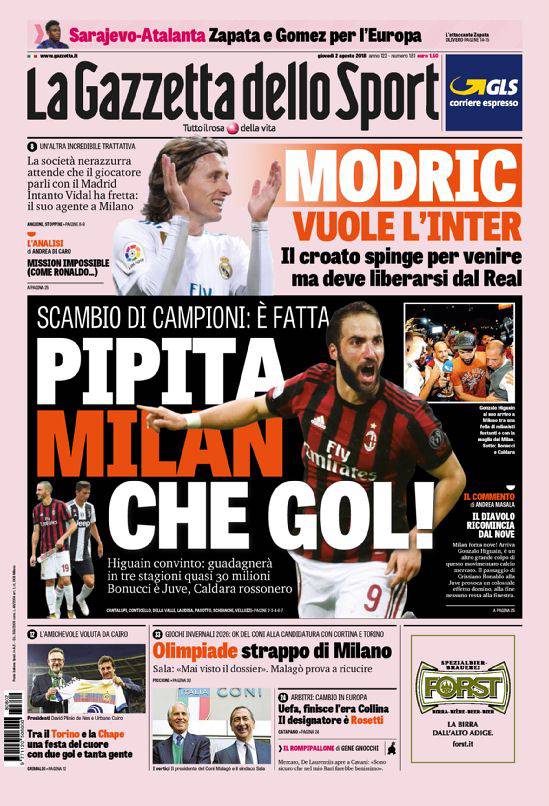 GAZZETTA DELLO SPORT – Anche qui campeggia Higuain al Milan, operazione per la quale manca soltanto la firma. Mentre l’Inter cerca di capire quanto possa essere percorribile l’affare Modric. Intanto chiuderà a breve per Arturo Vidal del Bayern Monaco. In basso, si parla di candidatura italiana per le Olimpiadi Invernali del 2026, chiudono poi la prima pagina altre notizie di calcio.