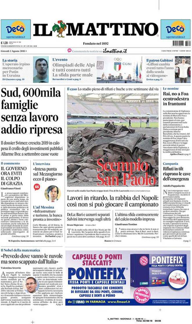 IL MATTINO – Il giornale napoletano nella sua edizione odierna presenta come al solito diversi aggiornamenti di politica e cronaca. Campeggia una foto dello stato disastroso dello stadio ‘San Paolo’, a sole tre settimane dall’inizio del campionato. Il Napoli è infuriato con il Comune.