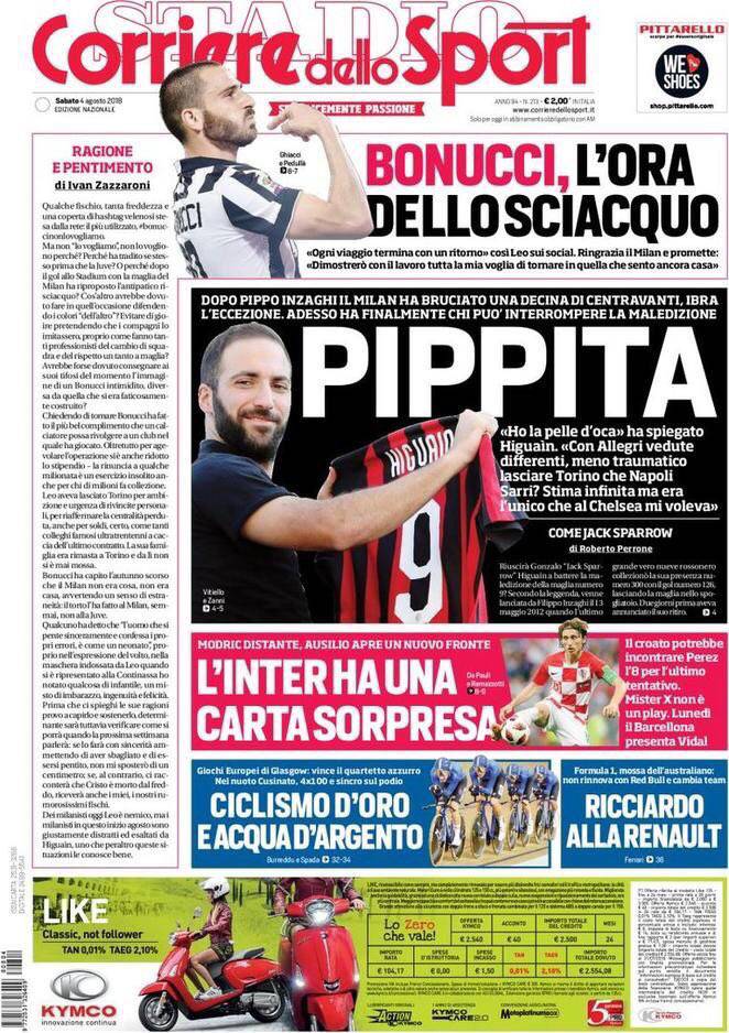 CORRIERE DELLO SPORT – La prima pagina dell’edizione campana del giornale romano mette in primo piano l’accoglienza dei tifosi del Milan per Gonzalo Higuain: “PiPPita. Dopo Pippo Inzaghi il Milan ha bruciato una decina di centravanti, Ibra l’eccezione. Adesso ha finalmente chi può interrompere la maledizione”. A Torino, invece, è tornato il figliol prodigo Leonardo Bonucci: “L’ora dello sciacquo. ‘Ogni viaggio termina con un ritorno’, così Leo sui social. Ringrazia il Milan”. Sul fronte calciomercato è sempre attiva anche l’Inter: “Ha una carta sorpresa. Modric distante, Ausilio apre un nuovo fronte. Il croato potrebbe incontrare Perez l’8 agosto per l’ultimo tentativo. Mister X non è un play. Lunedì il Barcellona presenta Vidal”. Oggi il Napoli affronterà in amichevole a Dublino il Liverpool di Alisson e Salah. Il test sarà molto indicativo per Ancelotti per capire lo stato di forma degli azzurri e il livello dei giocatori a disposizione.