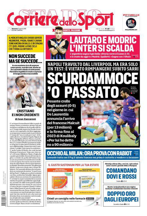 CORRIERE DELLO SPORT – L’apertura del quotidiano romano nella sua edizione campana è dedicato alla netta sconfitta del Napoli in amichevole contro il Liverpool. I vicecampioni d’Europa vincono per 5-0 ma la differenza di condizione è netta. In più ci si mettono alcune clamorose sviste arbitrali, come in occasioni di un gol regolarissimo annullato a Callejon. Le uniche, vere preoccupazioni vengono dal portiere Karnezis, mai sicuro. Ancelotti non fa drammi (“Meglio perdere ora così che tra un mese, questo ko ci aiuterà a migliorare”). E De Laurentiis annuncia il rinnovo di Koulibaly e l’acquisto del laterale destro Malcuit dal Lille. In alto, Lautaro Martinez decide l’amichevole Lione-Inter, 1-0 per i nerazzurri che continuano a sognare Modric del Real Madrid. Il Milan invece cerca Rabiot del Paris Saint-Germain. Chiudono altre notizie di vari sport.