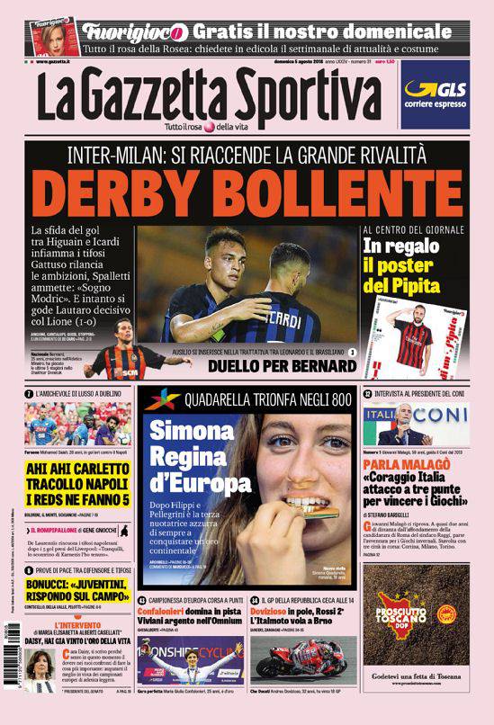 GAZZETTA DELLO SPORT – Il giornale in rosa è su di giri per le rinnovate ambizioni di Inter e Milan. Le due milanesi stanno compiendo degli ottimi acquisti sul mercato, e già l’attenzione è al prossimo derby che vedrà Icardi e Lautaro Martinez da una parte e Higuain dall’altra. Il Napoli perde 5-0 col Liverpool, Bonucci consapevole che deve riconquistare la fiducia dei tifosi della Juventus. Europei di nuoto a Glasgow, altra medaglia per l’Italia con Simona Quadarella oro negli 800. Chiudono altre notizie di calcio ed altri sport.