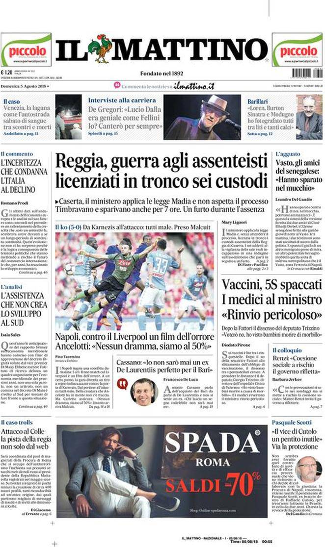 IL MATTINO – Il quotidiano di Napoli parla di notizie di cronaca e politica italiane. Per lo sport spicca il tracollo degli uomini di Carlo Ancelotti con il Liverpool. Troppa la differenza di condizione.